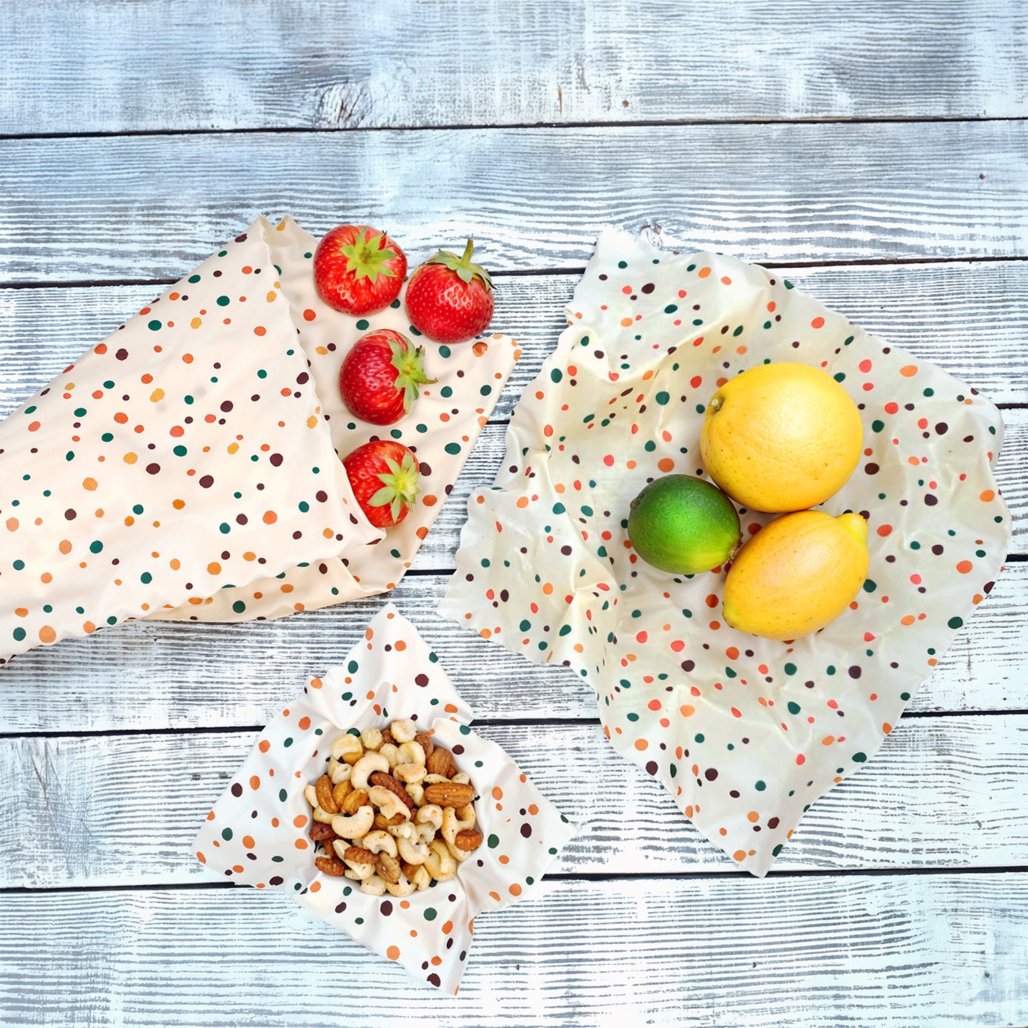 Bivaxdukar med lekfullt asymmetriska prickar i flera olika färger och storlekar.